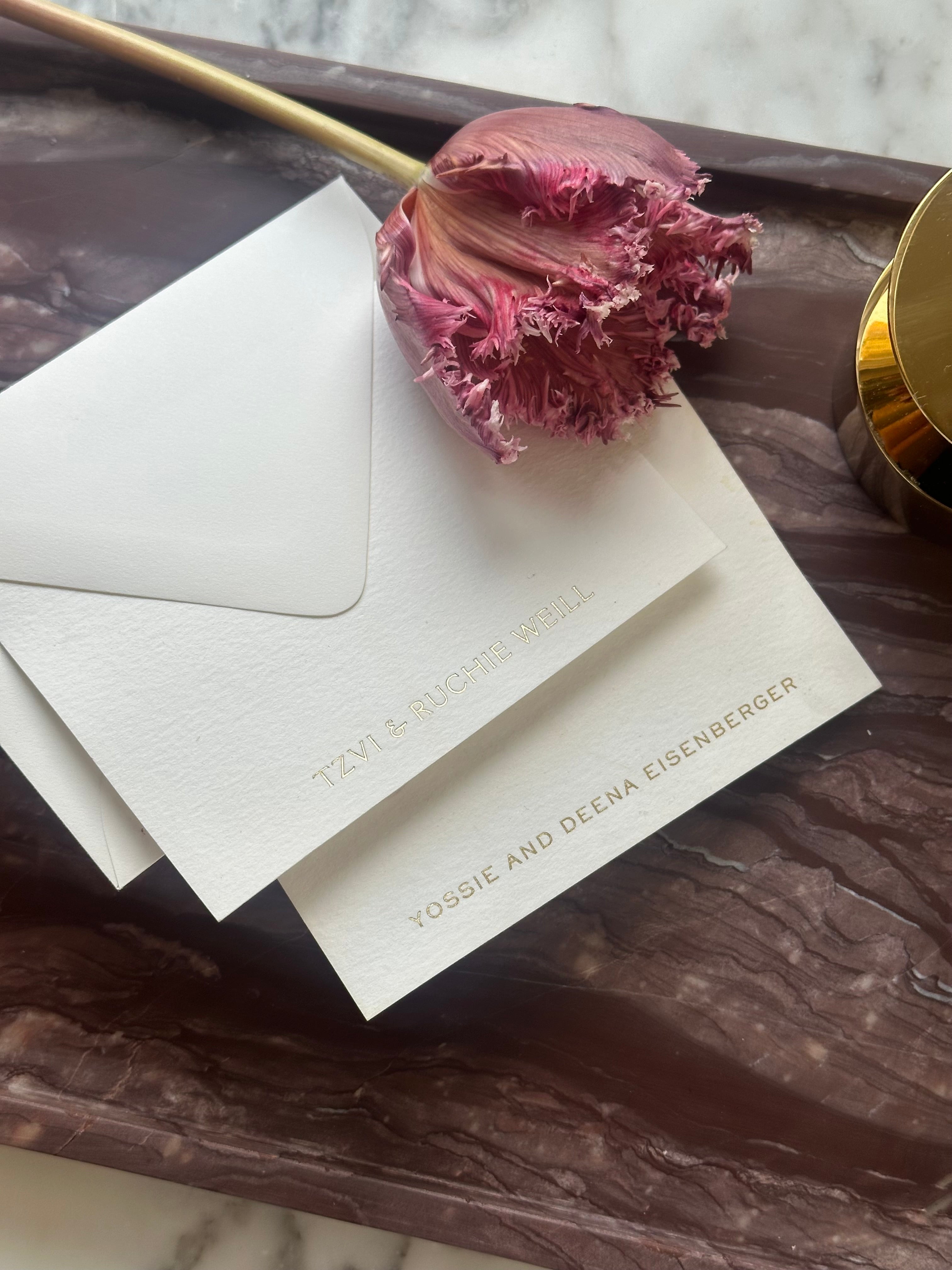 The cards are expertly printed on our luxuriously textured, signature 160lb white cotton stock. Choose from elegant letterpress or luminous foil stamp.